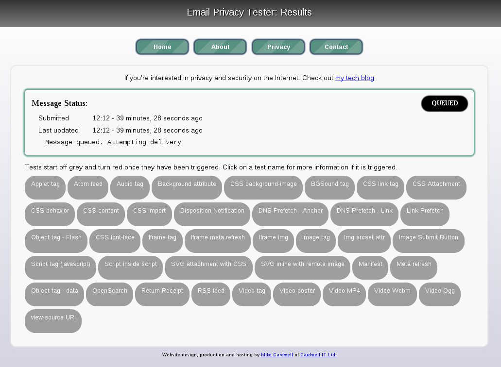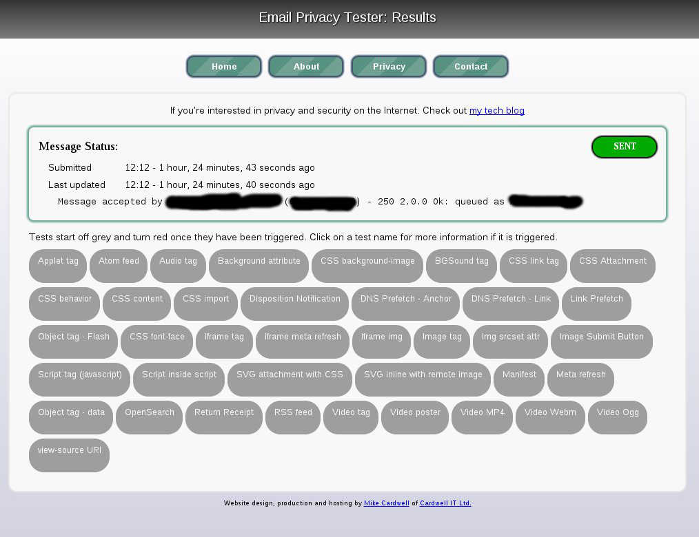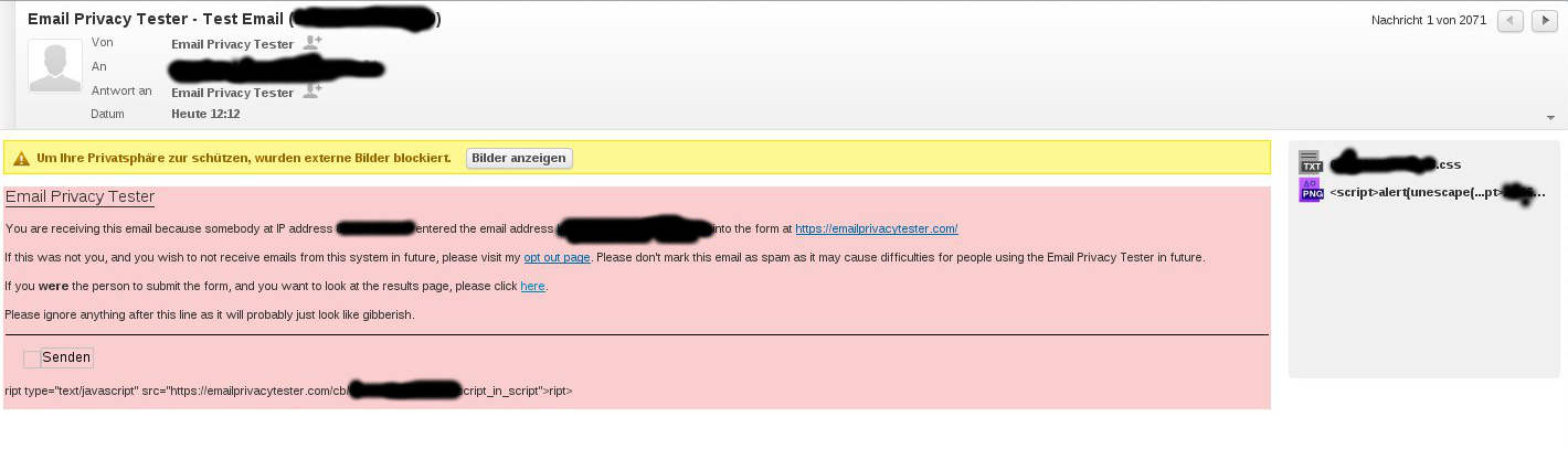 Die Mail sieht schon deutlich anders aus als in meinem Desktop Client, also schauen wir mal auf der Webseite vom Email-Privacy-Tester nach ob sich da in der Zwischenzeit etwas getan hat.