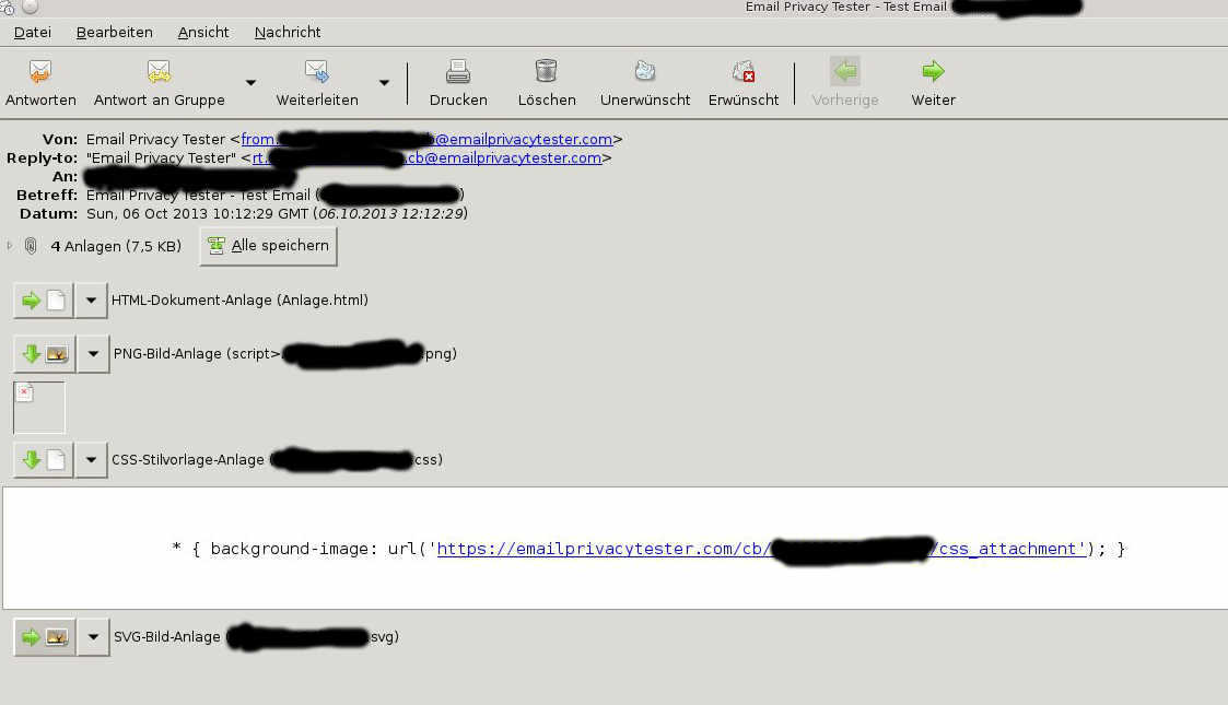 Auf diese weise arbeiten im übrigen auch die meisten Email Vieren, zumindest der Teil der nicht mit .exe bzw .pdf Anhang daher kommt. Lange Rede kurzer Sinn, ich habe mir dann heute mal mein Emailsetup angeschaut und siehe da NIX. Hatte ich zwar so erwartet, aber eine kleine Nachkontrolle hat ja noch nie geschadet. Allen die sich und ihr Setup selbst einmal Überprüfen möchten wird mit dem Email Privacy Tester das passende Werkzeug an die Hand gegeben. Ganz paranoide können das Tool natürlich auch selbst Hosten, den Quelltext gibt es auf Github, mir reicht für diesen kleinen Test allerdings direkt die Webseite (und natürlich meine Spam-Email Adresse 😉 ) Also Email Adresse eingetragen und los gings. Nach wenigen Sekunden hatte ich bereits die Email. In meinem aktuellen Desktop Email-Client „Evolution“ sieht das ganze dann so aus.