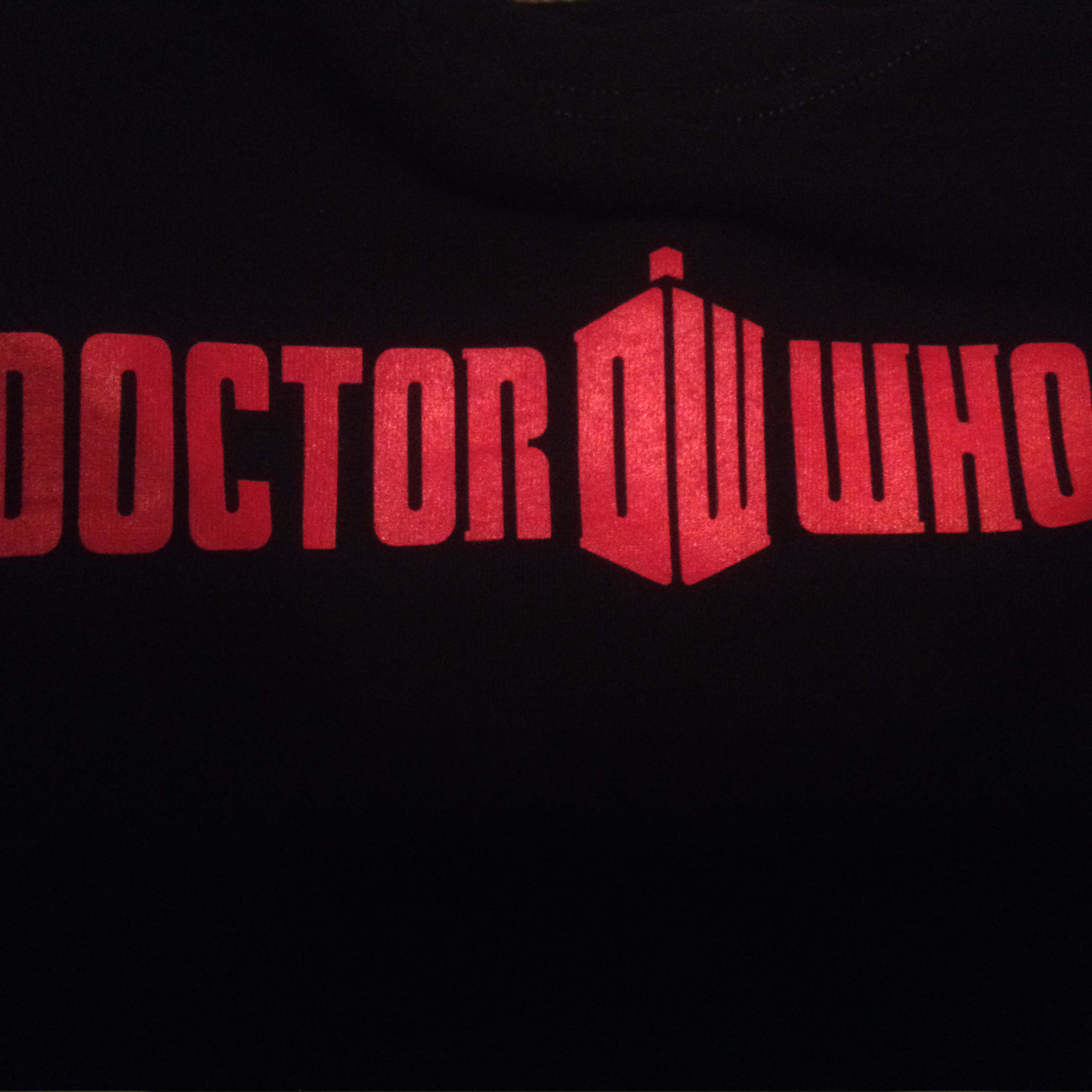 Auf der T-Shirt Rückseite prangt das Doctor Who Logo für alle die mit dem Darlek auf der Vorderseite nichts anfangen können.