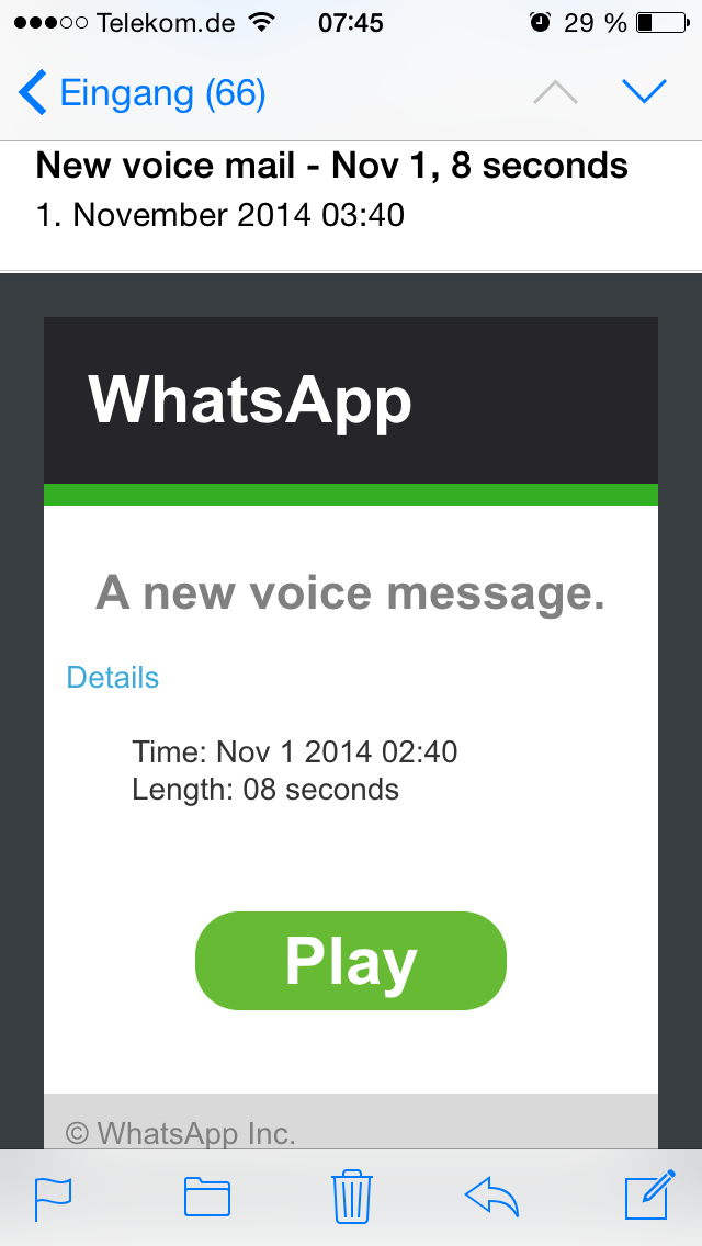 Wow, dachte ich mir. Zum einen „Seit wann zur Hölle hat WhatsApp nen Voice Nachrichten Dienst“ und zum anderen „Wer zum Teufel benutzt sowas?“ Da ich ja wie oben erwähnt schon einen Hilferuf per Whatsapp in der Nacht empfangen hatte hielt ich das dann, mit meinem etwas angeschlagenen Schädel, für die etwas nachdrücklichere Version von „Du hast doch bestimmt Samstagmorgens nichts besseres zu tun als mein Zeug durch die Gegend zu Karren“, was zeitlich sogar hinkommen würde. Ich klickte also auf „Play“ um mir und meinem Kater noch einmal genau vor Augen zu führen warum ich sowas denn tun sollte. Böser Fehler. Mein iPhone Browser switchte recht schnell auf eine „.ru“ Url die ich relativ schnell als nicht Whatsapp identifiziert hatte, zumindest wenn man bedenkt in welchem Zustand ich mich gerade befand. Mir gelang es vermeindlich noch den Browser davon abzuhalten die Seite komplett zu laden aber inzwischen war ich dann durchaus WACH!!!.