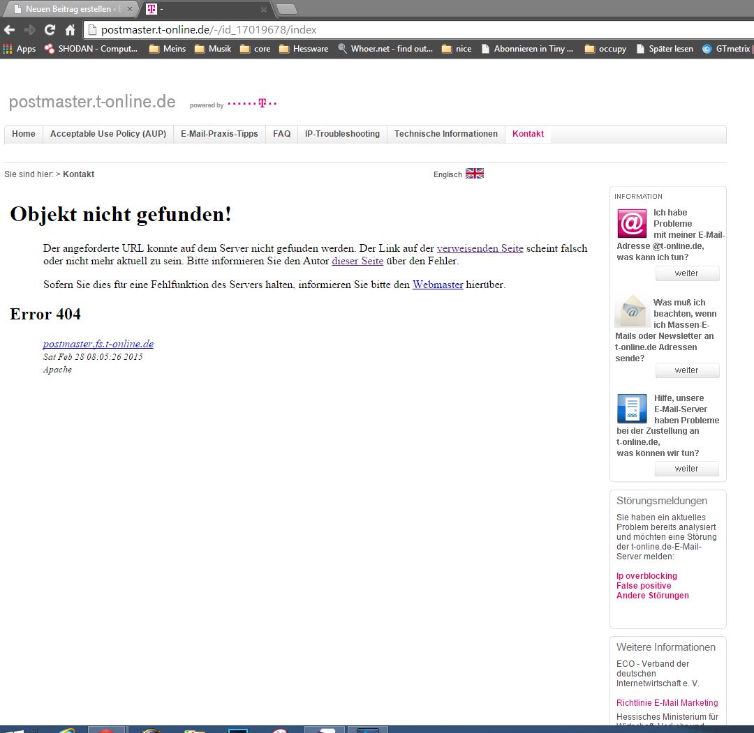Es ist inzwischen über 1 Jahr her das ich mich mit T-online Mailservern beschäftigen musste. Jetzt kam es leider wieder vor das ich mich mit jemandem auseinandersetzen musste der mir eine T-online Adresse gab. Ich stellte als fest das die T-Online Mailserver noch immer keine Mails von mir annehmen. Nach über einem Jahr hätte ich ja erwartet das ein Konzern von der Größe der Telekom inzwischen um ihre Kontaktformulare kümmert.