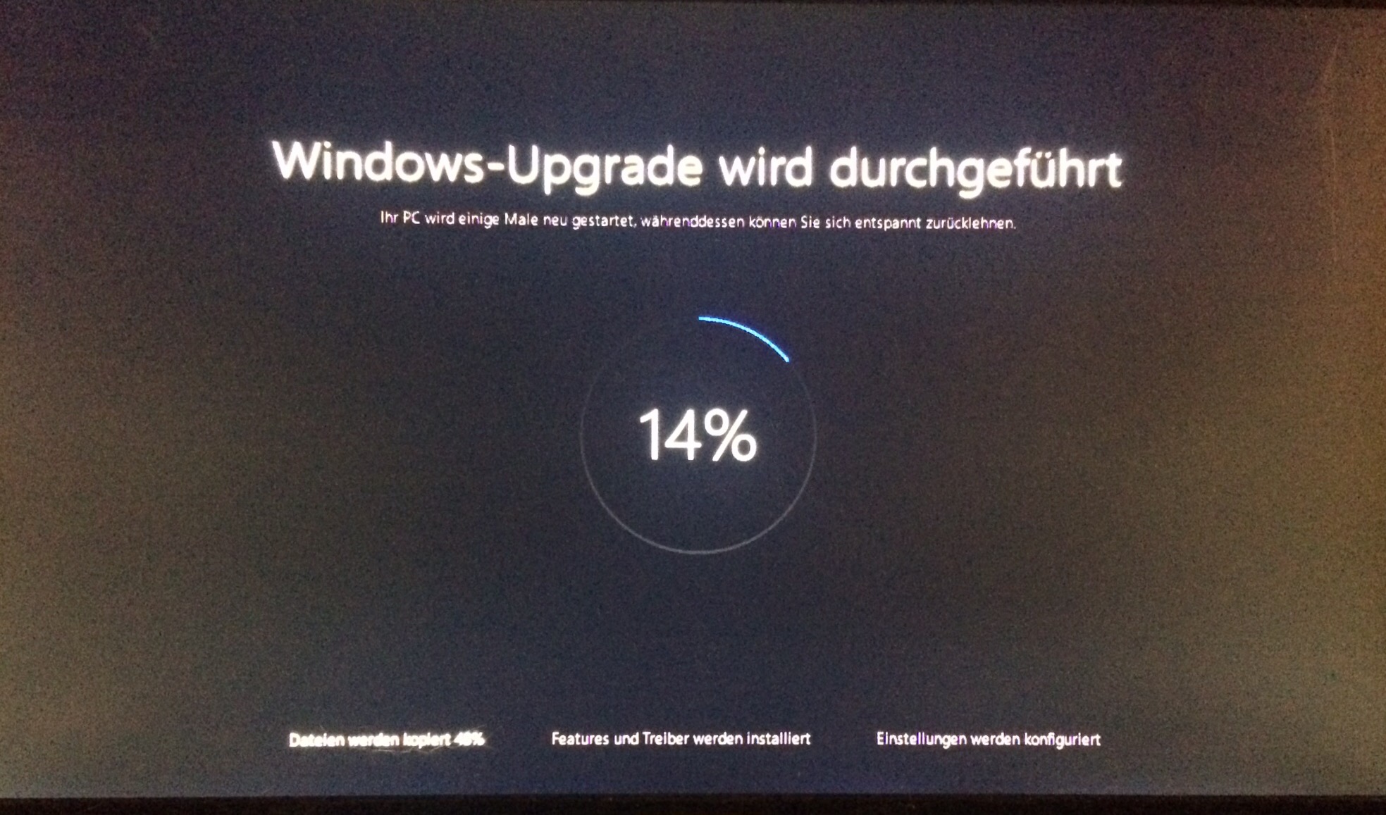 Ob jetzt mein Glaube an Microsoft oder die wohlige Wärme des Whiskys dazu geführt haben das ich mich noch in dieser Nacht an die Installation werde ich wohl nie ganz genau wissen, zumindest verbrachte mein Freizeitpc direkt nach meinem zustimmenden Klick ein wenig Zeit im Installationsbildschirm von Windows 10.