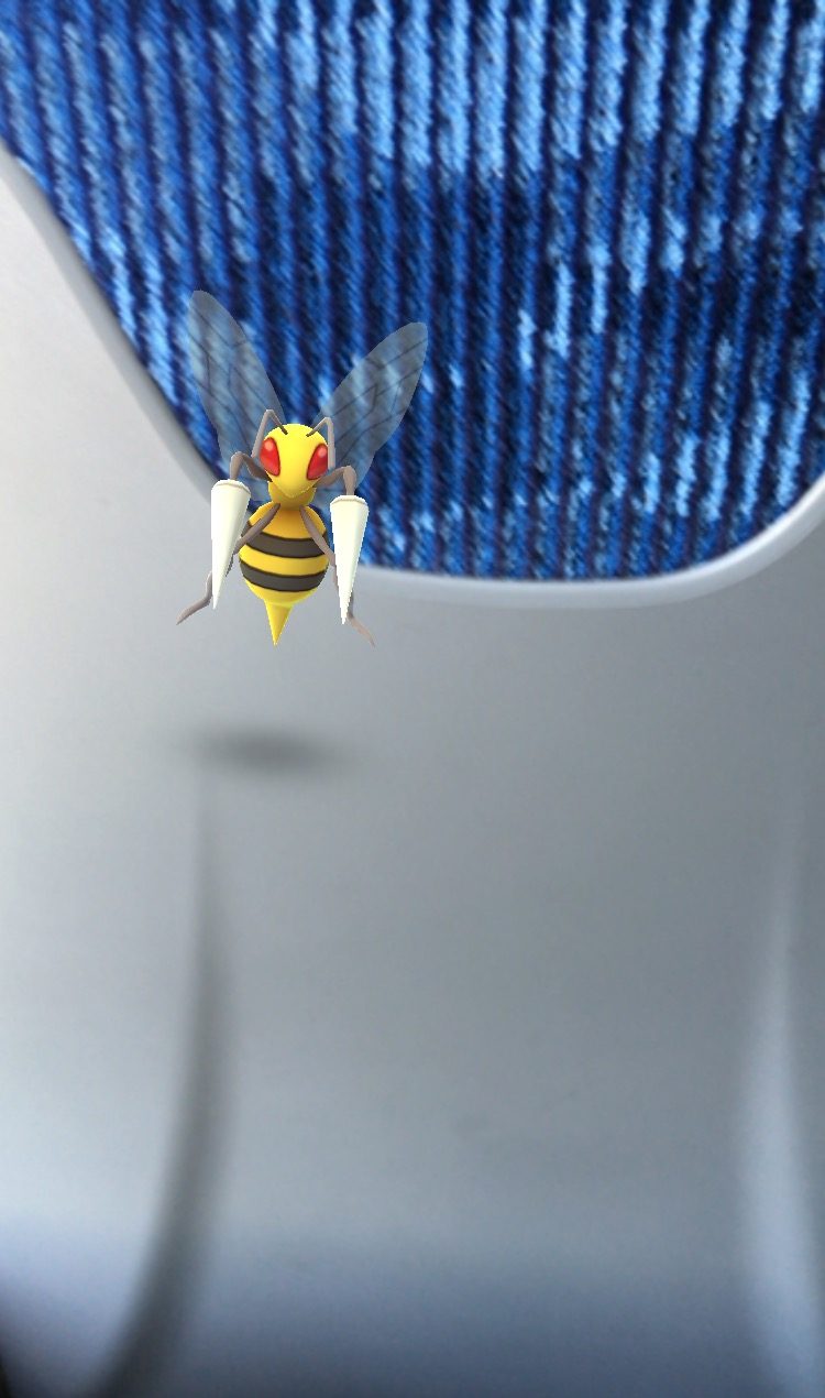 Hier ein fliegender Bibor vor einem Sitz in der Bahn, Augmented Reality im Pokemon Stil.