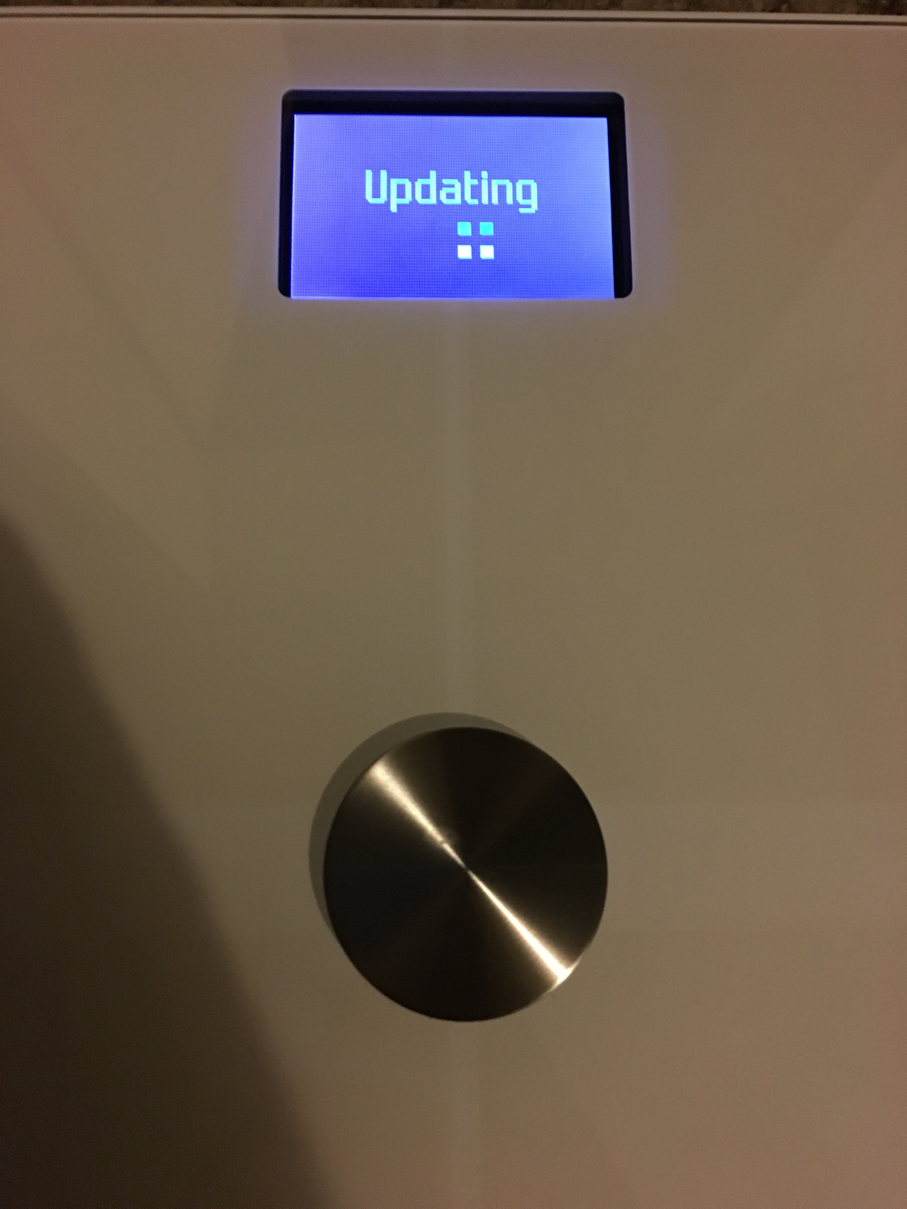 Beides habe ich jetzt, 2 Wochen später, in meinen Fingern. Eine Withings Body Waage, die mich künftig exklusiv fett nennen darf und als Tracker ein Garmin Vivosmart HR. Die Waage zeigt neben dem Gewicht auch Körperfettanteil, Wassergehalt, Muskelgewicht und Knochengewicht an. Doch bevor es soweit ist muss sich die Waage erst einmal updaten, Firmwareupdates bei einer Waage sind selbst für mich noch etwas neues.