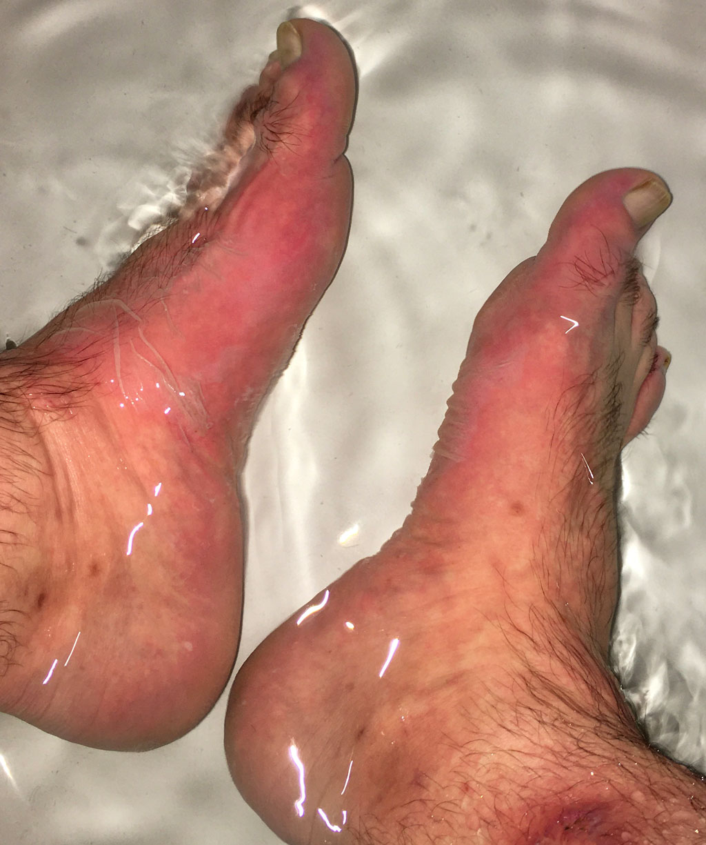 Es folgte eine kurze Desinfektion und ich durfte beim Aufschneiden und entfernen der Blasen zusehen. So hatte ich mir meinen Freitag Abend dann doch nicht vorgestellt. Versorgt wurde mit einer Brandsalbe die laut Arzt auch ein Schmerzmittel enthielt. Der Heimweg lief zumindest etwas weniger schmerzhaft ab. Begonnen haben die Schmerzen erst wieder als ich zuhause meine Schuhe wieder auszog. Die Nacht war dann ein echtes Highlight, immer gerade dann wenn ich kurz vor dem Einschlafen war gab es einen schönen brennenden Schub von meinen Füßen worauf ich wieder blitzartig wach war.