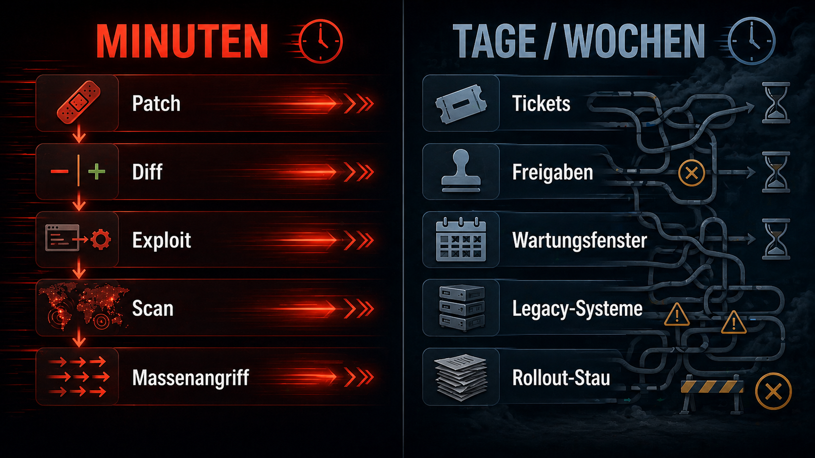 Auf der Verteidigungsseite beginnt nach einem Patchrelease erst einmal die übliche Prozession der Langsamkeit: Die Information muss ankommen. Jemand muss verstehen, dass sie relevant ist. Betroffene Produkte und Systeme müssen identifiziert werden. Zuständigkeiten müssen geklärt werden. Ein Wartungsfenster muss her. Dann wird getestet. Dann ausgerollt. Danach hofft man, dass wirklich alles getroffen wurde und nicht irgendwo noch eine vergessene VM, ein altes Appliance-Image oder ein halbtotes Legacy-System offen herumsteht.
