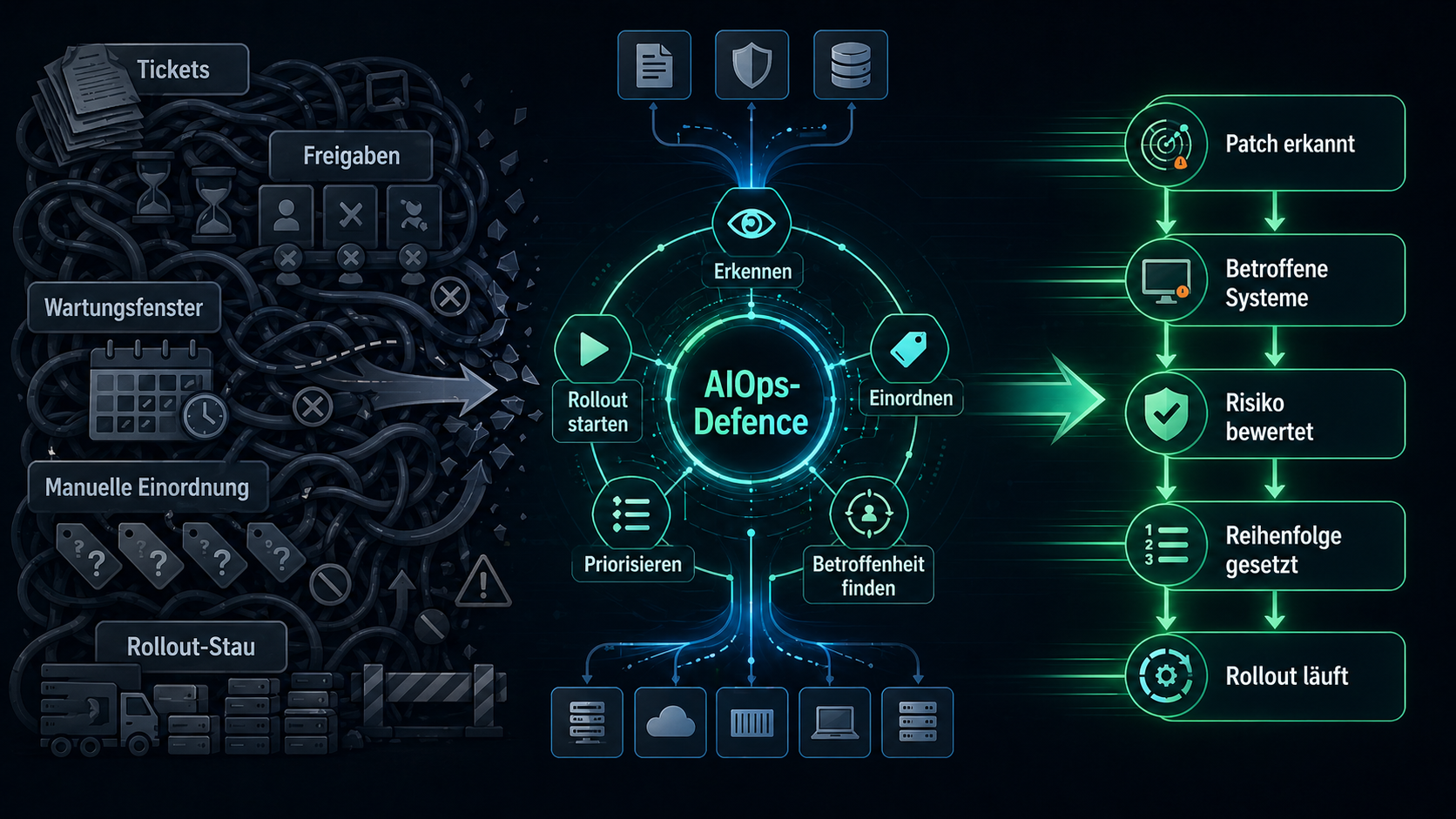 Genau hier wird AIOps sicherheitsrelevant: Da ist ein neuer Patch. Der ist dringend, weil aus Advisory und Diff sehr wahrscheinlich genau diese Schwachstelle hervorgeht. Diese Hosts, Images, Cluster, Appliances und Gerätegruppen sind betroffen. Diese Systeme sind internetnah. Diese davon stehen in kritischen Pfaden. Diese Updates fehlen noch. Diese Reihenfolge minimiert Risiko und Zeitverlust.