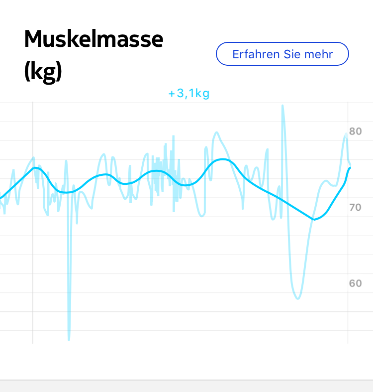Hier sieht man was meine Waage zu meiner Muskulatur zu sagen hat. Ich würde mal unterstellen man sieht hier den ein oder anderen Messfehler, aber hey immerhin scheinen unter meiner Fettschicht noch irgendwo Muskeln zu sein. Man sieht aber auch hier das meine Pläne 2018 wohl eher weniger aufgegangen sind.