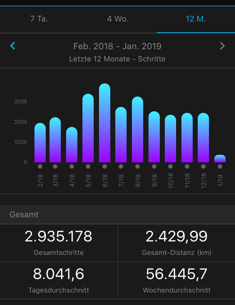Nachdem ich dauerhaft mit meinem Schrittzähler unterwegs bin sieht man hier wunderbar wie viele Schritte ich im Jahr 2018 zurückgelegt habe. Eigentlich ist die Statistik hier gar nicht so übel aber es muss wohl noch einiges zugelegt werden damit ich wieder auf ein menschenwürdiges Gewicht komme.