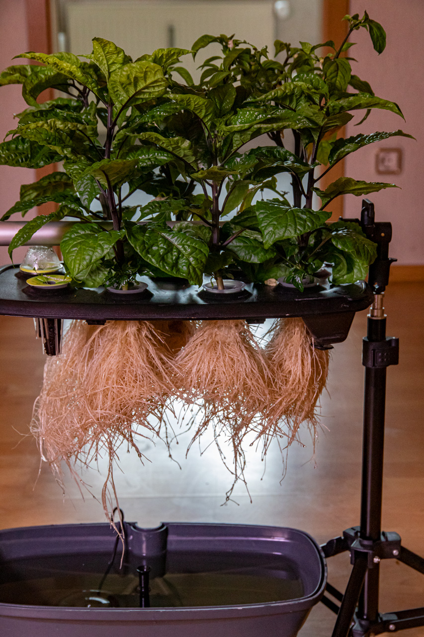 Die Wurzeln meiner kleinen Chiliaufzucht im AeroGarden. Langsam wird es da echt voll in der Nährlösung